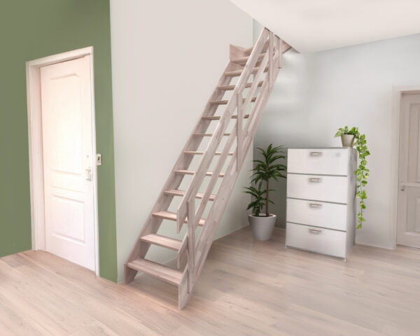 Cet escalier mesure 70 cm de large et a une hauteur de 300 cm du sol à l’étage, avec une inclinaison de 51°. Il peut être raccourci en hauteur et en largeur et est uniquement adapté à un usage intérieur. Sa capacité de charge maximale est de 150 kg.